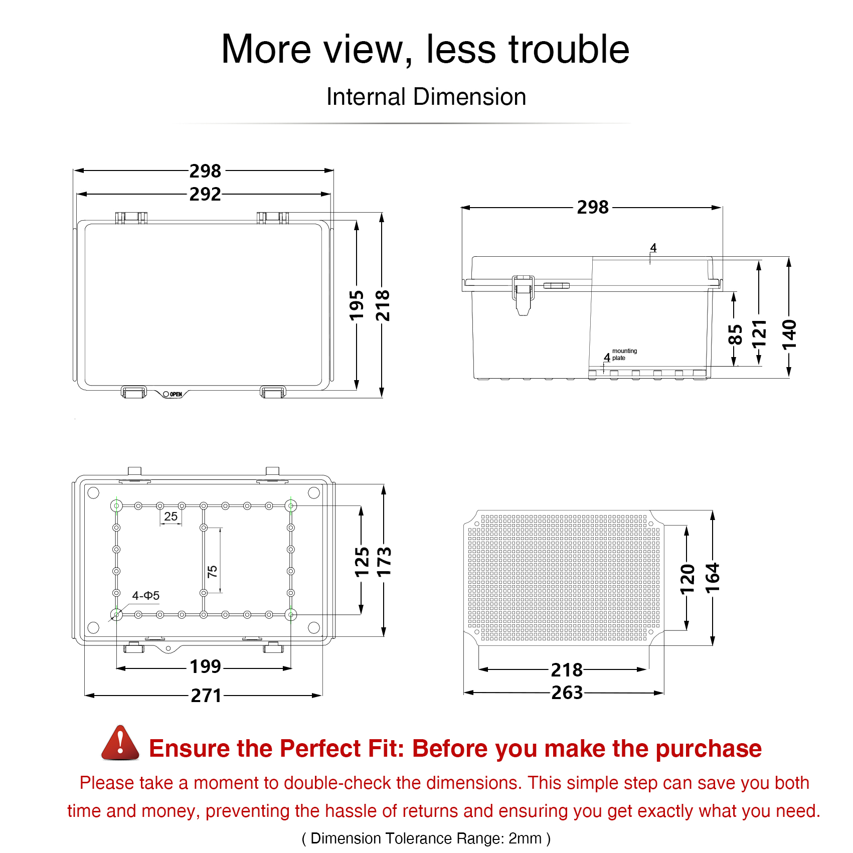 - 【Dimensions】: The External size is 11.4" x 7.5" x 5.5" (290 x 190 x 140 mm) for this waterproof box. The Internal size is detailed in our dimension drawing. Please double-check these dimensions before purchasing to ensure a perfect fit