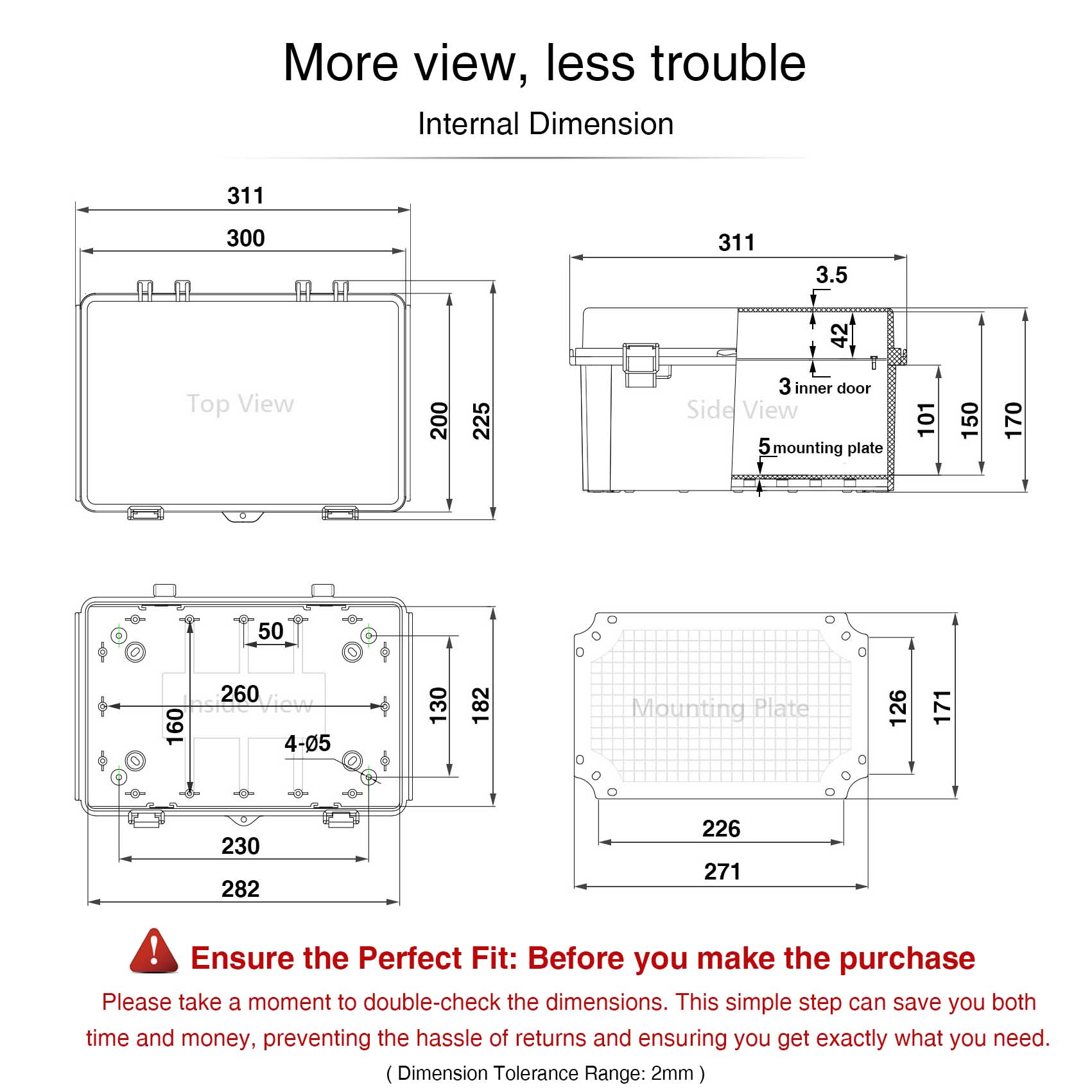 - 【Dimensions】: The External size is 11.8" x 7.9" x 6.7" (300 x 200 x 170 mm) for this waterproof box. The Internal size is detailed in our dimension drawing. Please double-check these dimensions before purchasing to ensure a perfect fit