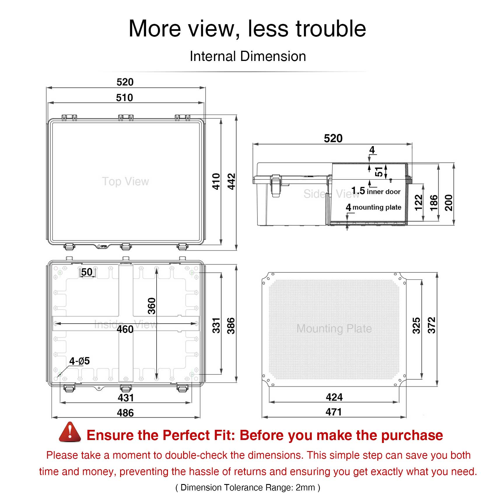 - 【Dimensions】: The External size is 20" x 16.1" x 7.9" (510 x 410 x 200 mm) for this waterproof box. The Internal size is detailed in our dimension drawing. Please double-check these dimensions before purchasing to ensure a perfect fit