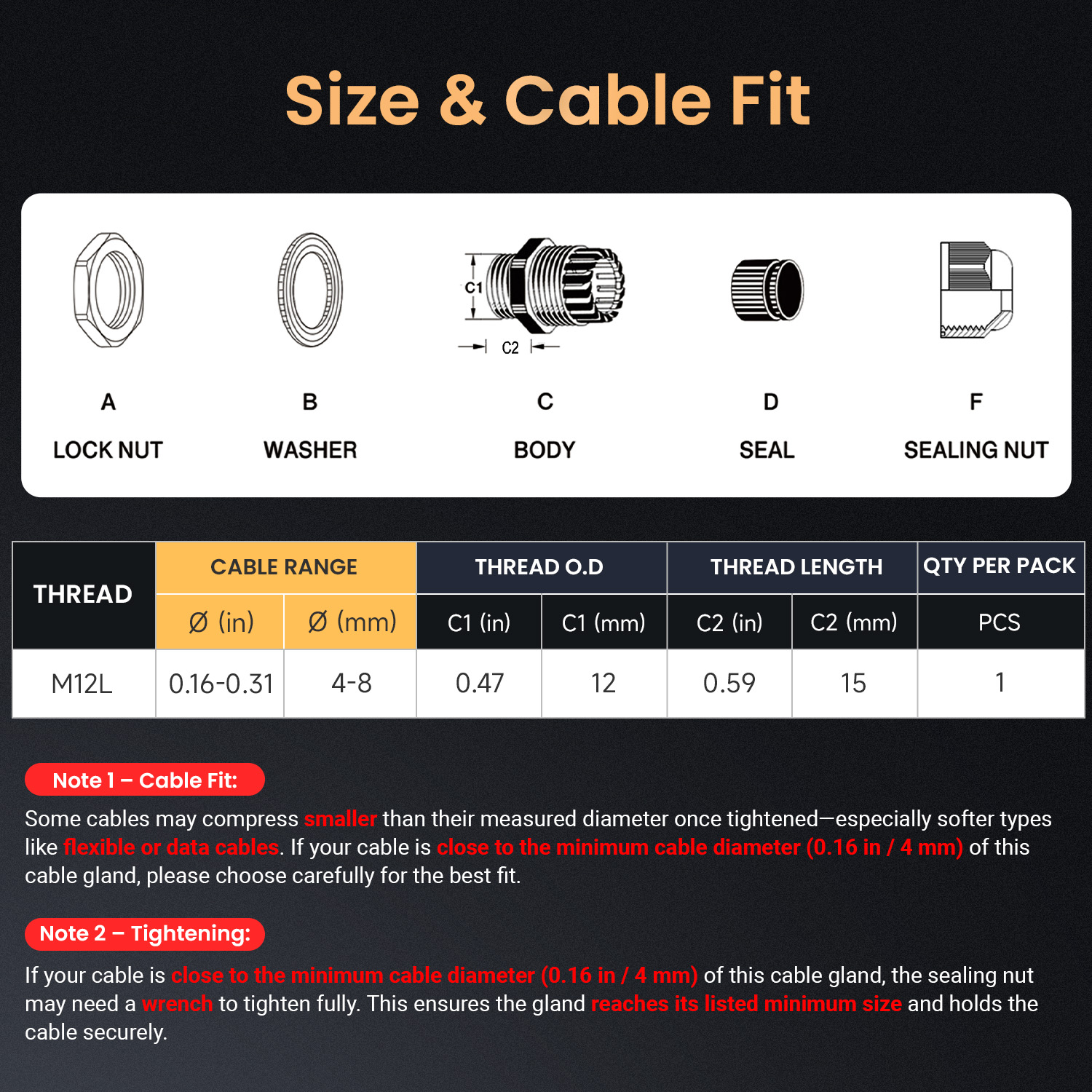 | Cable Range | 4-8 mm (0.16-0.31 inch) |
