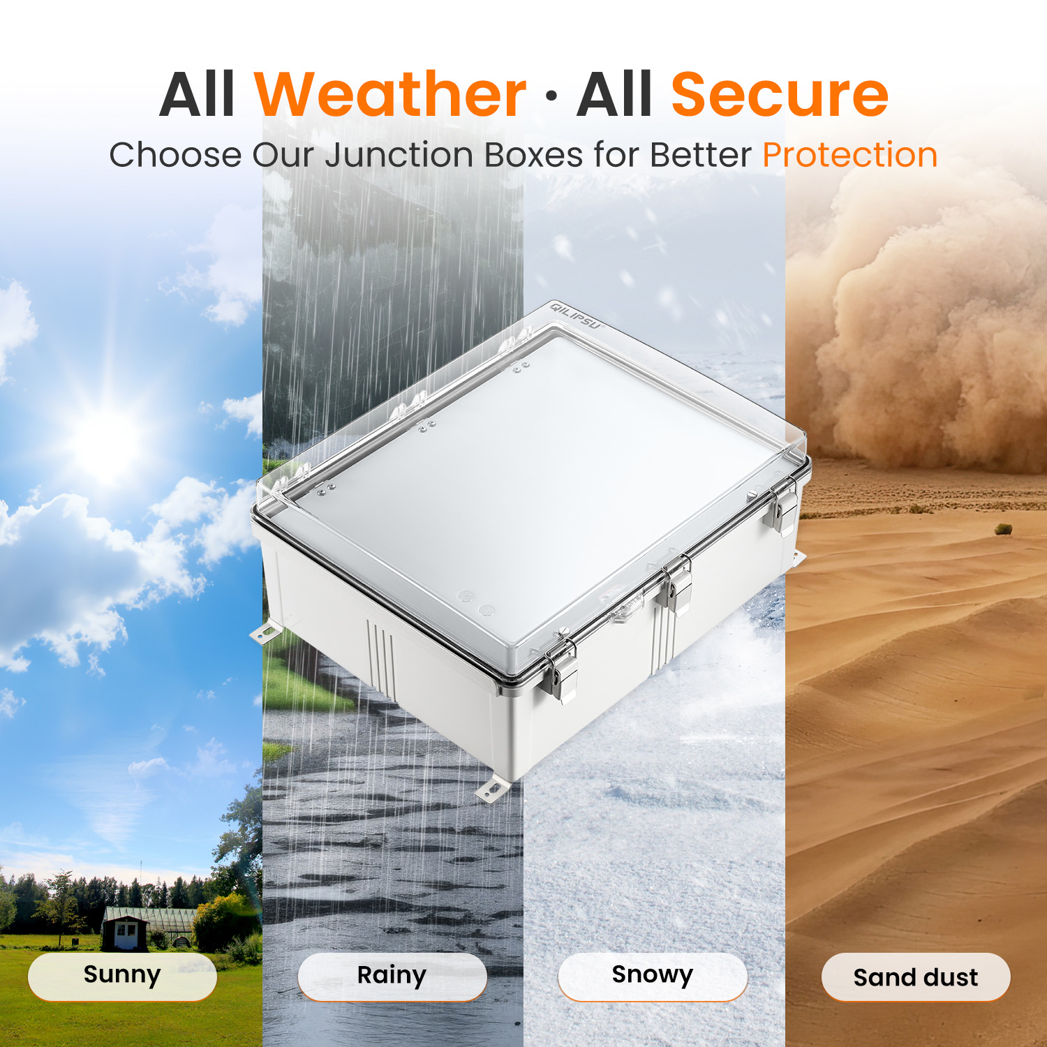 - 【Versatile Solutions】: Our waterproof electrical box is engineered to be suitable for wide applications, such as lighting systems, routers, POE switches, CCTV cameras, Starlink devices, solar panels, irrigation systems, ham radios, LEDs, power supplies, pool controls, Wi-Fi devices, and more. This versatility broadens your opportunities and gives you more flexibility
